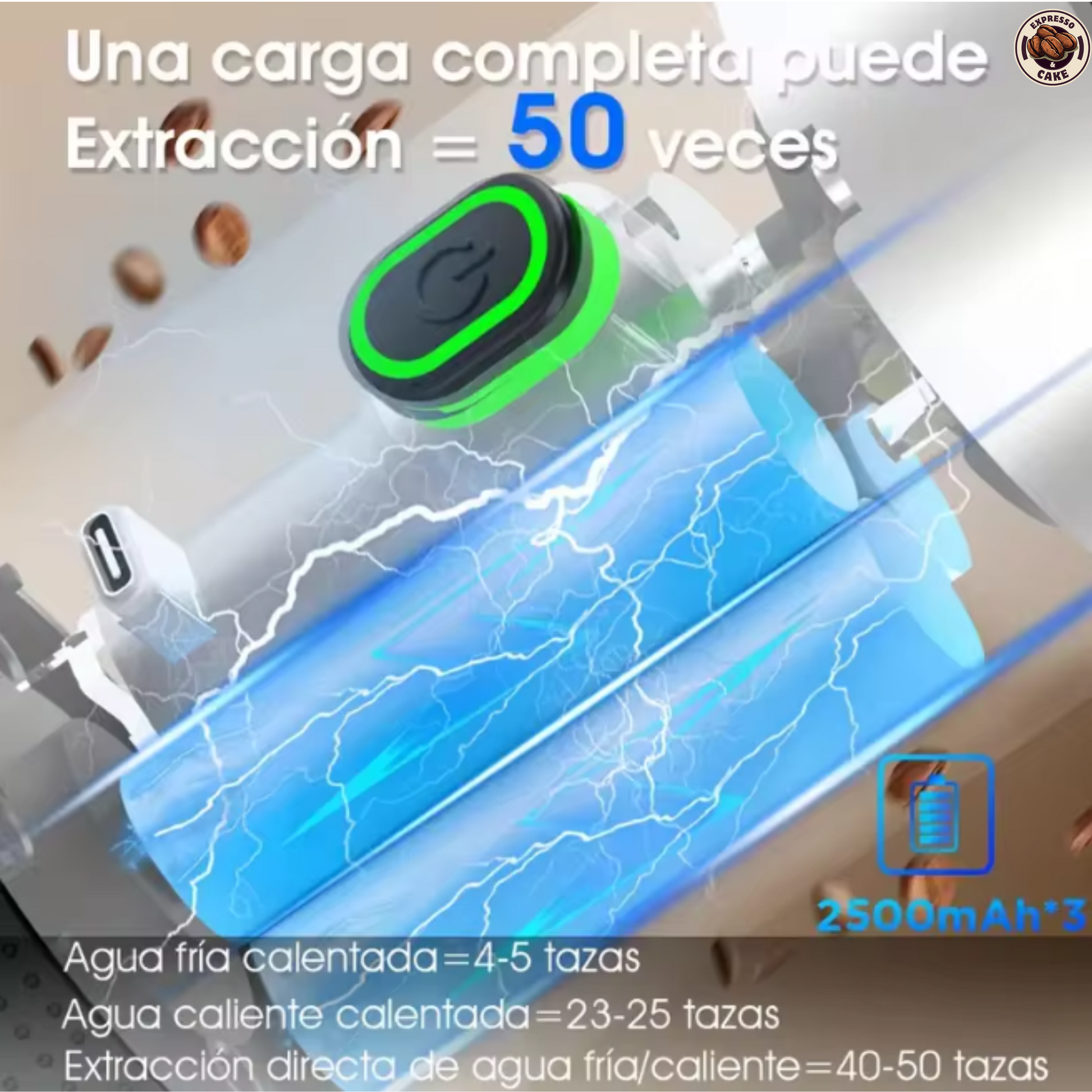 Prepara tu café donde quieras gracias a su batería de larga duración, con capacidad para hasta 50 cargas y varios días de uso sin recargar. Compacta, práctica y lista para acompañarte a todas partes.